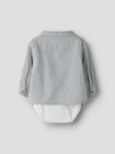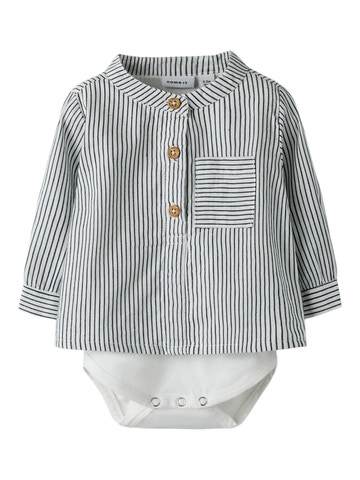 kundeservice@babysam.dkFar Langærmet Skjortebody fra NAME IT er det perfekte valg til både hverdag og festlige lejligheder. Denne skjortebody kombinerer det klassiske skjorte-look med den praktiske funktionalitet fra en body, så dit barn altid ser velklædt ud og samtidig har maksimal bevægelsesfrihed. De fine, lodrette striber i farven Cloud Dancer Navy Blazer giver et stilfuldt og moderne udtryk, mens de dekorative træknapper foran og brystlommen fuldender det elegante look. Bodyen har lange ærmer, hvilket gør den velegnet til både kølige og lune dage. Den praktiske trykknaplukning mellem benene gør det nemt at skifte ble, uden at du behøver tage hele skjorten af. Skjortebodyen har en komfortabel pasform, der giver plads til leg og bevægelse, og den er nem at tage af og på. Perfekt til både hverdagsbrug og særlige anledninger, hvor du ønsker, at dit barn skal være både smart og komfortabelt klædt på.