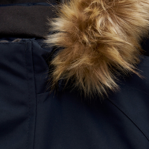 Flyverdragten lukkes med en robust kvalitets lynlås foran og ved de udvendige lommer. En blød hagebeskytter sikrer, at lynlåsen ikke generer under hagen. Hætten er aftagelig, og pelskanten kan nemt tages af. De justerbare støvlestropper i gummi kan placeres under støvlerne og forhindrer, at buksebenene glider op under leg.