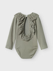 Fola ls badedragt fra Lil' Atelier er et skønt valg til sommerens strandture og svømmehaller. Den langærmede model beskytter mod solens stråler, mens den fine broderede krave giver et feminint og elegant udtryk. Dragten er lavet i en blød og behagelig ribkvalitet, der sikrer god komfort og bevægelsesfrihed for barnet. Den praktiske knaplukning i nakken gør det nemt at få dragten af og på, og den flotte støvede grønne farve passer til både hverdag og festlige lejligheder. Perfekt til små vandhunde, der ønsker både stil og funktionalitet.