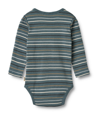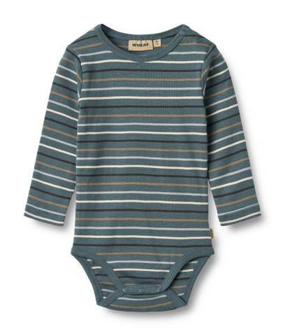 Langærmet body med striber i blødt økologisk bomuld til din baby. Wheats basis body er en sand klassiker i garderoben, når det kommer til småbørn. Denne body har trykknapper på den ene skulder samt i bunden for bedre komfort, når du skal klæde dit barn på. Brug bodyen som den inderste del i ethvert outfit, da den er blød at have tæt på huden. Du kan style bodyen afhængigt af vejr og årstid ved blandt andet at bruge den under et par smækbukser, leggings/bukser eller på kølige dage med en sweater/strik udover.