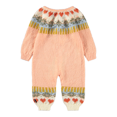 Heldragt fra Molo i blød alpakauld med nordiskinspireret mønster. Dragten har lange ærmer og ben samt en praktisk knaplukning foran, der gør den nem at tage af og på.