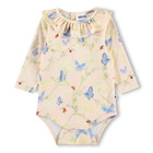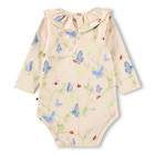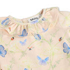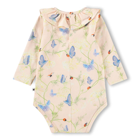 Freya Langærmet Body - Butterflys Cloud fra Molo er en yndig body til de mindste, der kombinerer komfort med et charmerende design. Bodyen er fremstillet i en blød og strækbar kvalitet, der sikrer optimal bevægelsesfrihed og komfort for barnet hele dagen. Det fine print med blå sommerfugle og små mariehøner på en lys baggrund giver et frisk og legende udtryk, som passer perfekt til både hverdag og festlige lejligheder. Den søde krave med flæser tilføjer et ekstra feminint touch, og de lange ærmer gør bodyen velegnet til både kølige og mildere dage. Bodyen har praktisk trykknaplukning i bunden, hvilket gør det nemt og hurtigt at skifte ble, og den elastiske halsudskæring sikrer, at bodyen er let at tage af og på. Materialet består af 95% bomuld og 5% elastan, hvilket gør bodyen både åndbar og behagelig mod den sarte babyhud. Freya bodyen er et oplagt valg til dig, der ønsker kvalitet og et sødt design til dit barn.