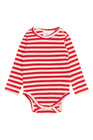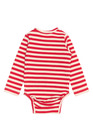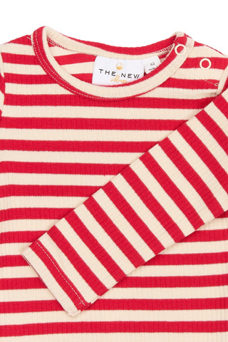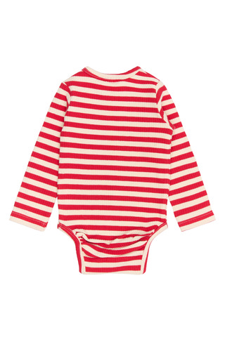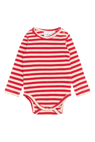 Denne langærmede body fra THE NEW Siblings er en blød og praktisk garderobe, der er vigtig for de små. Den har et klassisk stribet design og en slim pasform, hvilket gør den behagelig at have på under andet tøj. Kroppen lukkes med trykknapper ved skulder og bund, hvilket gør det nemt at tage på og skifte. Perfekt til både hverdagsbrug og leg.
