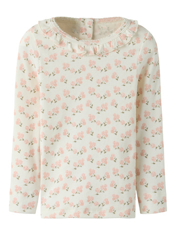 Sæt det perfekte outfit sammen til dit barn med kvalitetsstilarter til hverdagsbrug, og skab et behageligt og trendy look. Jersey er et let og elastisk stof med en blød overflade og inderside, der giver en behagelig fornemmelse og bevægelsesfrihed. - Produkttype: Top - Halsudskæring: Rund halsudskæring - Ærmer: Lange ærmer (L/S) - Lukning: Knaplukning - Ekstra detaljer: Flæser, mærke - Print: Print gentaget over hele produktets overflade - Pasform: Slim Fit
