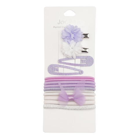 Multi pakke i lilla farvetema med 14 spænder og hårelastikker