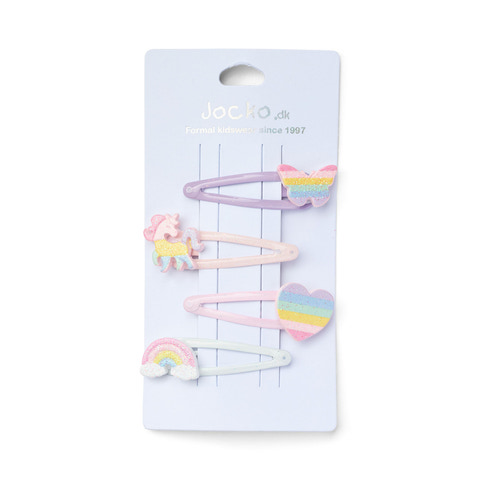 Gør håret ekstra festligt med disse fine hårspænder fra Jocko! Sættet består af fire forskellige spænder, alle i flotte pastelfarver og dekoreret med glimmer og søde motiver som sommerfugl, enhjørning, hjerte og regnbue. Spænderne er nemme at sætte i håret og sidder godt fast, så de både kan bruges til at holde håret væk fra ansigtet i hverdagen eller som pynt til særlige anledninger. De bløde farver og glitrende detaljer gør dem populære hos børn, der elsker at sætte deres eget præg på dagens outfit. Hårspænderne er lette at åbne og lukke, så barnet selv kan tage dem af og på. Perfekt som en lille gave eller som ekstra tilbehør til garderoben.
