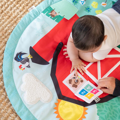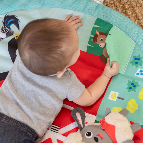 Udforsk en hel bondegård fyldt med sjov og læring med aktivitetstæppet Happy Harvest fra Baby Einstein. Dette farverige aktivitetstæppe fra verdens førende producent af aktivitetstæpper* er designet til at engagere babyer i sanseleg og støtte udviklingen af motoriske færdigheder. Tre måder at lege: ligge og lege, mave-tid og sidde op. Den bløde og støttende legemåtte har 5 sanselige overraskelser til baby: Udforsk den bløde sky, mærk den glatte satinsol, åbn ladeportene og vinduet, eller kig bag græsset for at finde et skjult dyreven.