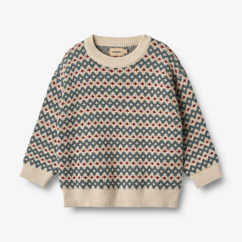 Langærmet striktrøje med mønster i blødt økologisk bomuld til børn. Wheat's strik er en tro følgesvend i de kolde efterårs- og vintermåneder, da det er blødt og behageligt for dit barn at have på uden nogen form for kløe. Wheat strik har et klassisk look med en afslappet pasform, der gør det nemt at style med et par bukser eller over en kjole alt efter vejr og begivenhed.
