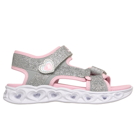 SKECHERS Heart Lights Sandals i sølv er den perfekte sommersandal til børn, der elsker sjov og farver. Sandalen kombinerer komfort med et iøjnefaldende design, hvor den glitrende sølvfarvede overdel og de fine hjerte-detaljer skaber et festligt look. Den bløde, lyserøde indersål giver god støtte til små fødder, og de justerbare velcroremme gør det nemt for barnet selv at tage sandalen af og på. Den unikke sål har hjerteformede udskæringer, som lyser op ved hvert skridt, hvilket gør sandalen ekstra sjov og populær blandt børn. Sandalen er let og fleksibel, så den er behagelig at have på hele dagen – både til leg i haven, på stranden eller til sommerens fester. SKECHERS Heart Lights Sandals er designet med fokus på både komfort og stil, og den slidstærke konstruktion sikrer, at sandalen holder til mange timers leg. Med denne sandal får dit barn en kombination af glimmer, lys og hjerter, der spreder glæde og gør sommeren endnu sjovere.