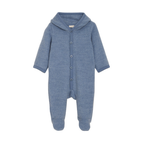 Ulddragt fra Fixoni. Dragten er lavet i børstet uld og har en hætte med påsyede ører. Knaplukning foran, ombuk ved ærmerne og fødder. Certificeret i hht. OEKO-TEX® STANDARD 100 Cert. No. 2276-364 DTI. Lavet af Merinould, og det er WOOLMARK - Merino Extra Fine certificeret under licens nr: 0030001353 af THE WOOLMARK COMPANY.