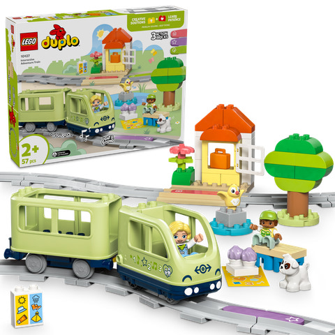 Små børn kan sætte sig i førersædet med legetøjet Interaktivt oplevelsestog (10427). Med dette toglegetøj til børnehavebørn fra 2 år kan de mindste bestemme, hvor turen går hen, og derefter begive sig ud på en rejse fyldt med lys, lyde og læring. Bygge- og ombygningslegetøjet indeholder klodser til at bygge en park, strand, togstation eller familiens hjem, så tumlinger skærper nysgerrigheden og finder kreative måder at bygge på. Læringslegetøjet øger børns tålmodighed og styrker finmotorikken og kreativiteten, når de fokuserer på at bygge togbanen og lave en rute for passagertoget. De 3 funktionsklodser gør legen levende, og legetøjstoget laver realistiske lyde, når det kører hen over dem, hvilket booster børns forudsigelsesevner, når degætter, hvilken lyd toget vil lave. De kan også bruge den særlige tilpasningsklods til at afspille deres egne lyde, der kan optages med den gratis LEGO® DUPLO® app Interactive Trains, og de kan køre toget ved hjælp af en bærbar elektronisk enhed.