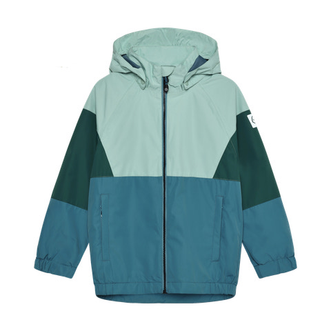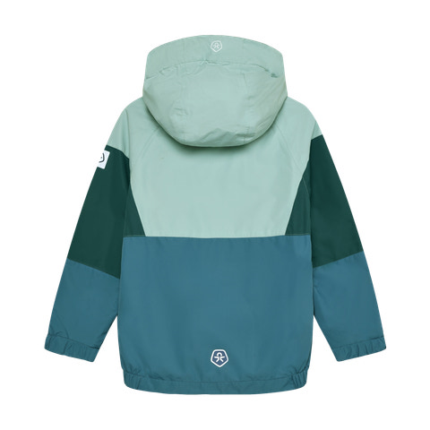 Flerfarvet jakke med aftagelig hætte fra Color Kids. Jakken er udstyret med lynlåslomer, elastik i bunden af jakken samt en lille stofbeskyttelse i enden af lynlåsen ved hagen for ekstra komfort. Materialet er vand- og smudsafvisende samt har tapede sømme.