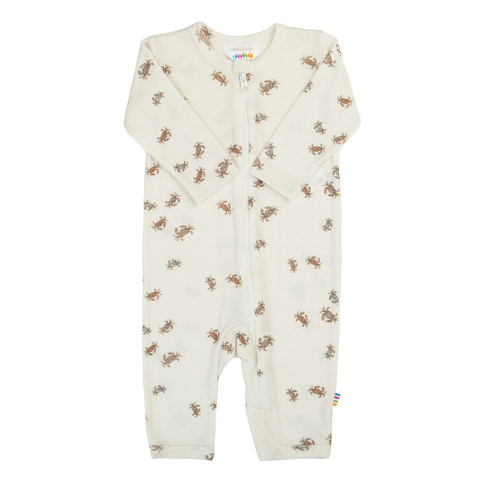 Denne heldragt er designet med en trykknap ved halsen og en praktisk lynlås, der går ned langs fronten og videre gennem det ene ben, så det bliver ekstra nemt at klæde de mindste af og på.