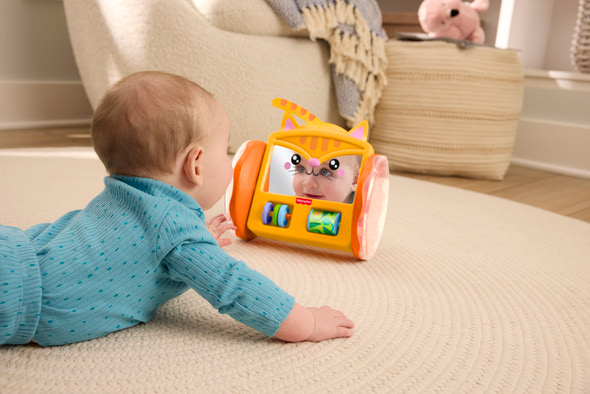 Fisher-Price Kæledyr Kravl&Leg Kattespejl er det ideelle legetøj til at gøre mave- og kravletiden ekstra spændende for de mindste. Dette farverige kattespejl er designet til at fange barnets opmærksomhed med sit søde katteansigt og de mange sjove detaljer. Spejlet hjælper barnet med at udforske sit eget spejlbillede, hvilket styrker selvopfattelsen og nysgerrigheden. Når spejlet rulles frem og tilbage, aktiveres de farverige perler og roterende tromler, som både stimulerer syns- og høresansen. De små hænder kan gribe fat i de forskellige elementer, hvilket fremmer finmotorikken og hånd-øje-koordinationen. Kattespejlet er let at skubbe og rulle, så det motiverer barnet til at bevæge sig og styrker de store muskelgrupper. Det robuste design gør det sikkert for selv de mindste at lege med, og de glade farver og former gør det til et hit i ethvert legehjørne. Fisher-Price Kæledyr Kravl&Leg Kattespejl er perfekt til at understøtte barnets udvikling gennem leg og bevægelse.