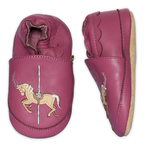 Hjemmefutter fra MELTON i blødt læder, med elastisk kant. Futternes overdel er i læder og dekoreret med en karussel, med heste. Futterne har udtagelige såler, og foer i bomulds frotté.