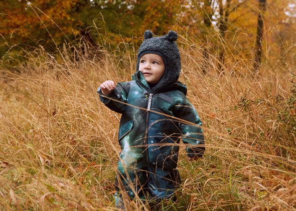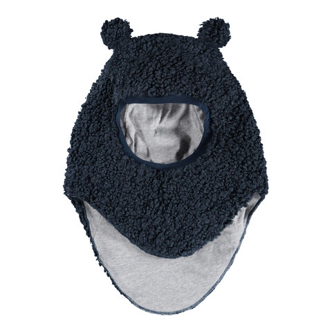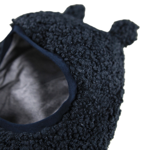 Elefanthue fra Molo i blød teddy-fleece med fine bamseører. Huen dækker både hoved, hals og ører og holder barnet dejligt varmt. Indvendigt er den foret med blød jersey i gråmelange for ekstra komfort.