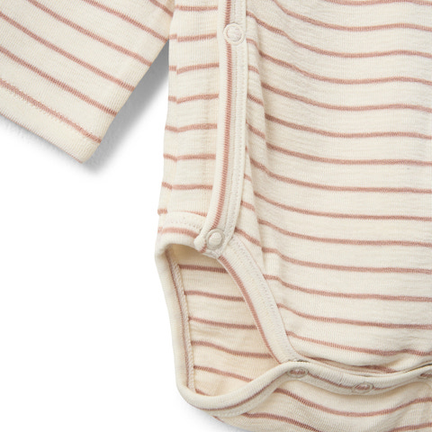 Kaya Langærmet Body - Rose stripe fra Sofie Schnoor Kids er en skøn body, der kombinerer funktionalitet og stil til de mindste. Bodyen er fremstillet i en blød og strækbar kvalitet med 95% bomuld og 5% elastan, hvilket sikrer en behagelig pasform og god bevægelsesfrihed for barnet. Den praktiske slå-om lukning med trykknapper gør det nemt at klæde barnet på og af, især for nyfødte, hvor det er vigtigt at undgå at trække tøjet over hovedet. De fine rosa striber giver et sødt og tidløst udtryk, der passer til både hverdag og festlige lejligheder. Bodyen har lange ærmer, som beskytter mod kulde og gør den ideel til brug året rundt – enten alene eller som et lag under andet tøj. Sofie Schnoor Kids er kendt for deres høje kvalitet og sans for detaljer, og denne body er ingen undtagelse. Den er designet med fokus på både komfort og æstetik, så dit barn kan føle sig godt tilpas og se skøn ud på samme tid. Bodyen er nem at vedligeholde og tåler maskinvask, hvilket gør den praktisk for travle forældre. Et oplagt valg til garderoben, hvor både funktion og design er i højsædet.
