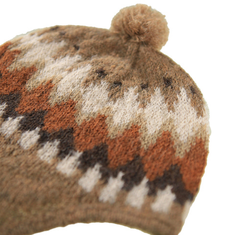 Kyse fra Molo i en blød alpaka-uldblanding med et nordiskinspireret mønster. Den bindes under hagen med snøre for en tæt og behagelig pasform og har en lille dekorativ top.