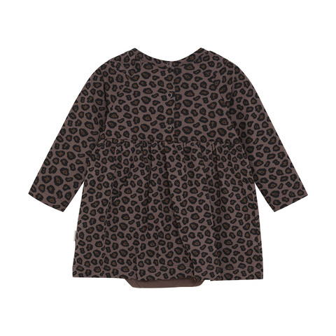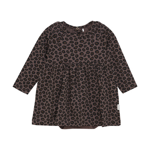 Den indbyggede body sikrer, at kjolen bliver, hvor den skal – også under leg. Fremstillet i en blød økologisk bomuldsblanding, der er skånsom mod barnets hud.