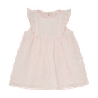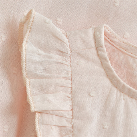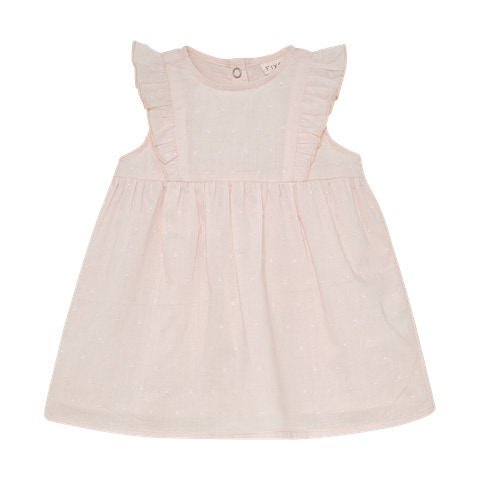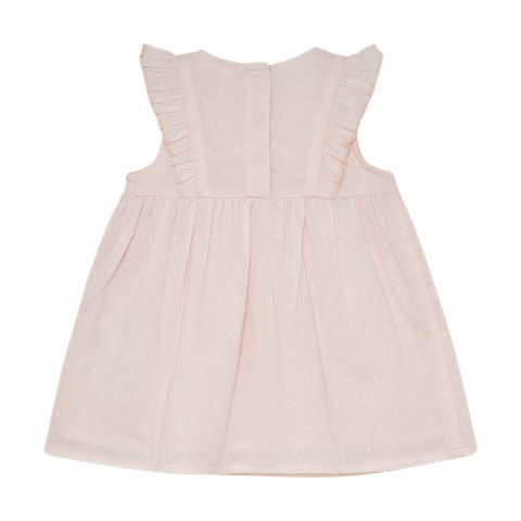 Denne smukke kjole fra Fixoni i farven Soft Pink er et oplagt valg til både hverdag og særlige lejligheder. Kjolen er fremstillet i et blødt og let materiale, der sikrer komfort for barnet hele dagen. De fine flæser ved skuldrene og det diskrete prikkede mønster giver kjolen et elegant og feminint udtryk, mens den praktiske trykknaplukning i nakken gør det nemt at tage kjolen af og på. Pasformen er rummelig og behagelig, så barnet kan bevæge sig frit og lege uden begrænsninger. Kjolen kan styles med strømpebukser eller leggings for et sødt og fuldendt look.