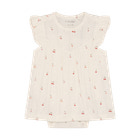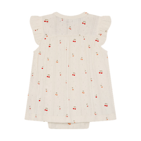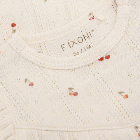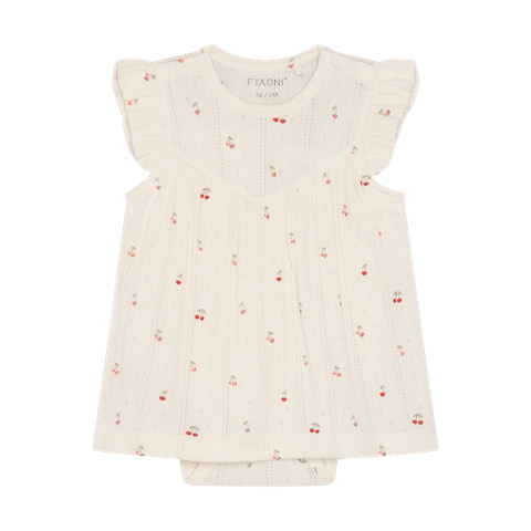 Kortærmet Bodykjole Pointelle fra Fixoni er en yndig og komfortabel løsning til de mindste. Kjolen kombinerer det praktiske fra en body med det fine udtryk fra en kjole, så din baby både ser sød ud og har maksimal bevægelsesfrihed. Den bløde pointelle-strik med små kirsebærmotiver giver et let og luftigt look, mens flæserne på skuldrene tilføjer et ekstra feminint touch. Trykknapperne i bunden gør det nemt at skifte ble, og den bløde kvalitet sikrer, at kjolen føles behagelig mod huden hele dagen. Perfekt til både hverdag og festlige lejligheder, hvor komfort og stil går hånd i hånd.