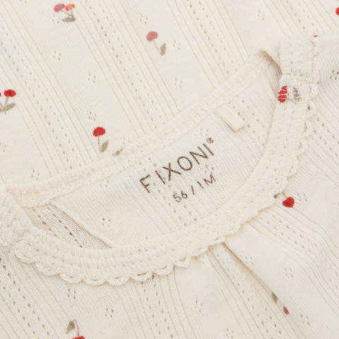 Langærmet Body Pointelle fra Fixoni er et skønt valg til de mindste. Den bløde pointelle-strik føles behagelig mod barnets hud og giver god bevægelsesfrihed. Med det fine kirsebærprint og de små detaljer får bodyen et sødt og klassisk udtryk, der passer til både hverdag og fest. De lange ærmer sørger for ekstra varme, og de praktiske trykknapper i bunden gør det nemt at skifte ble. Bodyen er designet med fokus på komfort og funktionalitet, så både barn og forældre får en god oplevelse. Fixoni er kendt for deres høje kvalitet og bløde materialer, hvilket gør denne body til et sikkert valg i garderoben.
