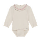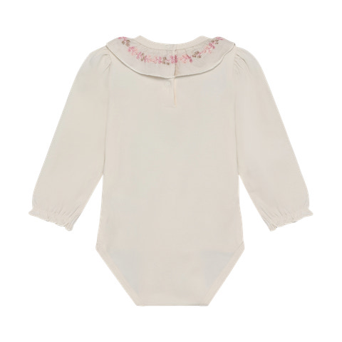 Minymo Langærmet Body - White Swan er en yndig og komfortabel body til de mindste. Den er fremstillet i en blød og lækker kvalitet, der føles behagelig mod barnets hud. Bodyen har lange ærmer og en smuk flæsekrave med fine, broderede blomster, som giver et elegant udtryk. Praktiske trykknapper i nakken og mellem benene gør det nemt at tage bodyen af og på, samt skifte ble. Perfekt til både hverdag og festlige lejligheder, hvor barnet skal være ekstra fint klædt på. Bodyen kan nemt kombineres med bukser eller nederdel for et sødt look.
