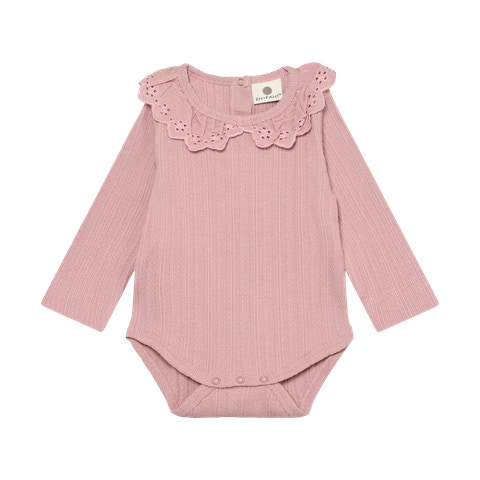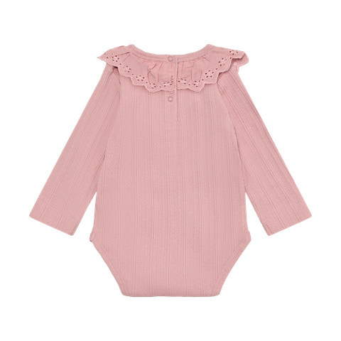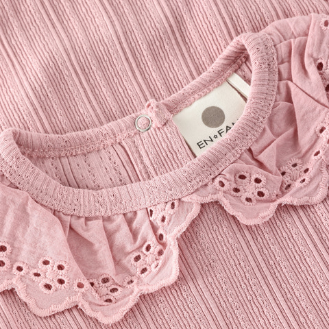 Den langærmede Pointelle Body fra En Fant er et skønt valg til både hverdag og festlige lejligheder. Bodyen er fremstillet i en blød og strækbar kvalitet, der sikrer maksimal komfort for dit barn hele dagen. Den fine pointelle-struktur giver et elegant og feminint udtryk, mens den dekorative krave med broderidetaljer tilføjer et ekstra touch af charme. Bodyen har lange ærmer, som holder barnet varmt, og de praktiske trykknapper i bunden gør det nemt og hurtigt at skifte ble. Halsåbningen er designet med en lille knap i nakken, så det er let at få bodyen over hovedet.