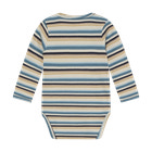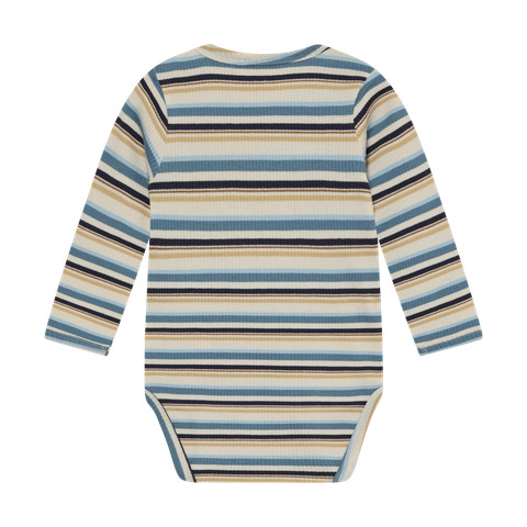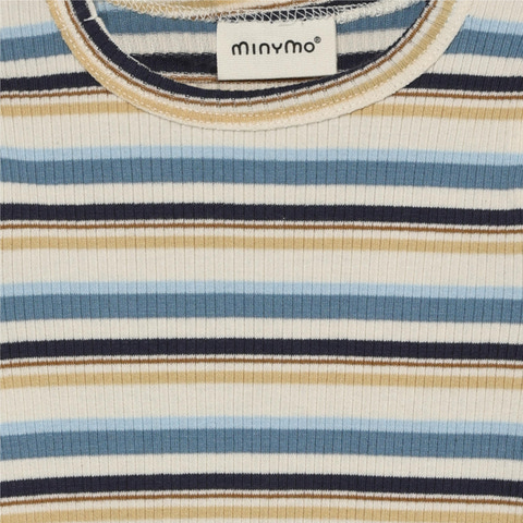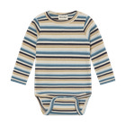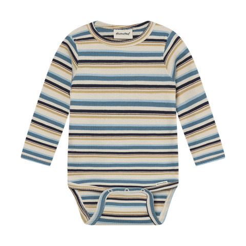 Den langærmede rib body med striber fra Minymo er et skønt valg til både baby og tumling. Bodyen er fremstillet i en blød og elastisk ribkvalitet, der sikrer god bevægelsesfrihed og komfort hele dagen. De klassiske striber giver et tidløst look, som passer til enhver garderobe. Bodyen har praktiske trykknapper ved skulderen og mellem benene, hvilket gør det nemt at klæde barnet på og skifte ble. Perfekt til både leg og afslapning, og kan bruges alene eller som et varmt lag under andet tøj.