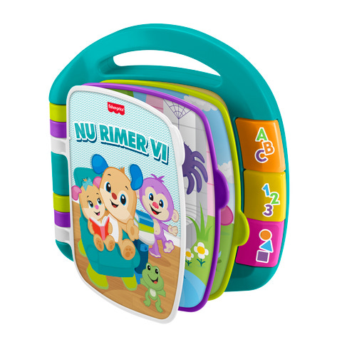 Fisher-Price Leg & Lær Historiebog Rim DK er en underholdende og lærerig aktivitetsbog, der inviterer de mindste ind i en verden af rim, sange og eventyr. Bogen er designet med farverige sider, der er lette at bladre i for små hænder, og har et praktisk håndtag, så barnet nemt kan tage den med sig rundt. Når barnet trykker på de store knapper i siden, aktiveres sjove lyde, melodier og lys, som gør læseoplevelsen endnu mere spændende. Bogen introducerer barnet for bogstaver, tal, former og farver gennem leg og musik, hvilket styrker både sprogudvikling og motoriske færdigheder. Perfekt til hyggestunder sammen eller til selvstændig leg, hvor barnet kan bladre, lytte og synge med på de glade rim og sange.