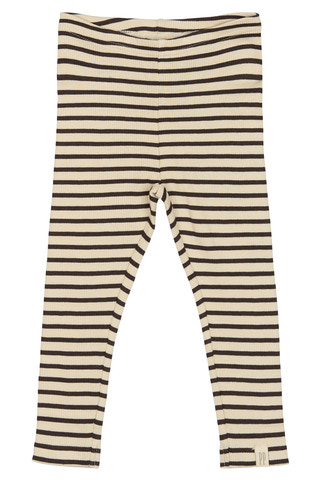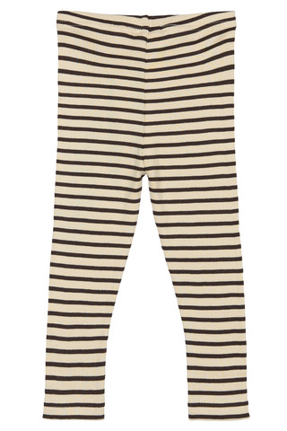 Leggings med klassiske striber fra Petit Piao i økologisk bomuld. Striberne er i to farver, hvor bundfarven er en cremefarvet, så striberne beholder sit klassiske look. Der er en elastik i livet, som gør det let for barnet selv at tage på. Der er 5% elastan i, så barnet har let ved at bevæge sig og lege. De er produceret i Indien.