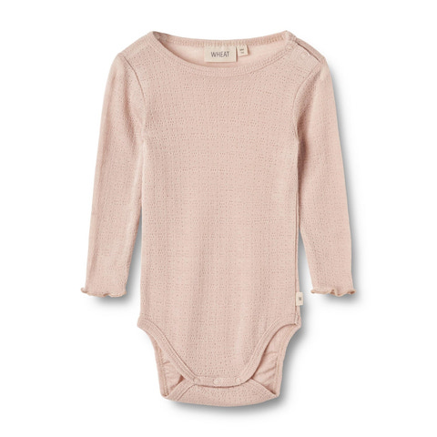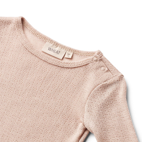 Bodyen har en almindelig pasform og er designet med praktiske trykknapper på skulderen og i skridtet, som gør den nem at tage af og på. De overlockede detaljer ved manchetterne samt det fine hulmønster giver et fint og gennemført udtryk.