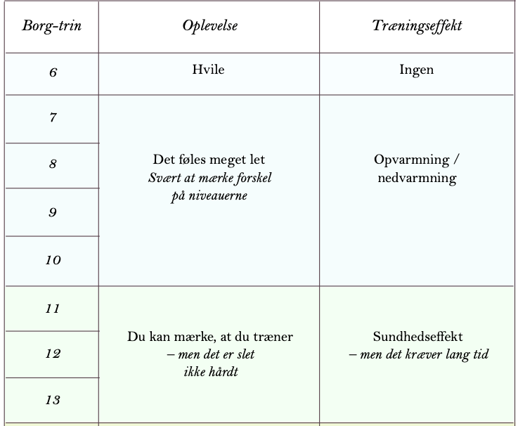 Her ser du Borg-skalaen. Til venstre i skalaen kan du læse, hvilken følelse der refereres til, og i højre side, hvilken effekt træningen ved den givne intensitet skal have.