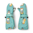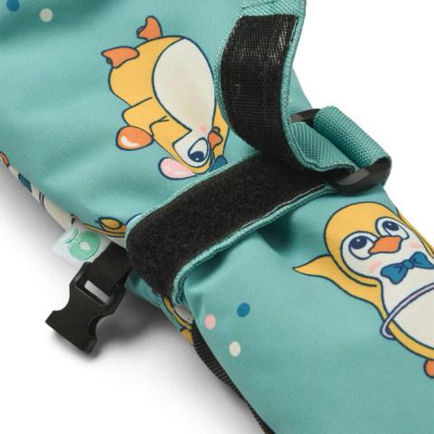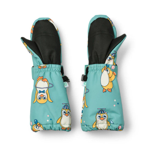 Luffer med pingviner. Disse luffer har en justerbar velcrostrop ved håndledet og kan klipses sammen med et spænde. Handskerne har slidstærk belægning i i håndfladen og et længere skaftestykke ved håndleddene, der forhindre kold vind og sne fra at trænge ind.