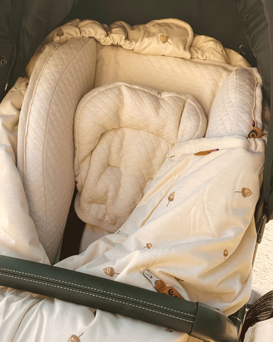 Perfekt til forår, sommer og efterår Super blød Lavet af genbrugsmaterialer 100% bomuld mod barnet Kan forlænges Vind- og vand afvisende Åndbar Universale sele huller Øko-Tex certificeret (18.HCN.38944) Kan foldes ud og bruges som legetæppe Maskinvask 40 grader uldprogram. Brug Ikke skyllemiddel. Centrifugeres let, max 500 omdr. Må ikke tørretumbles