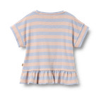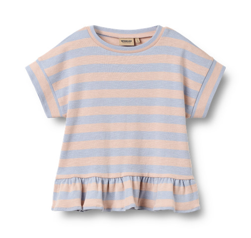 Marie T-Shirt fra Wheat er en skøn og komfortabel t-shirt til børn, der kombinerer klassisk stribet design med moderne detaljer. T-shirten er fremstillet i 100% økologisk bomuld, hvilket sikrer en blød og behagelig følelse mod huden – perfekt til både leg og afslapning. De fine pudderfarvede striber giver et friskt og sommerligt udtryk, mens den søde flæsekant forneden tilføjer et feminint og legende twist til looket. Marie T-Shirt har korte ærmer med opsmøg og en rund halsudskæring, som gør den nem at tage af og på. Den er ideel til både hverdag og festlige lejligheder, og kan nemt styles med et par shorts, leggings eller en nederdel. Wheat er kendt for deres fokus på komfort, kvalitet og bæredygtighed, og denne t-shirt er ingen undtagelse – den er både slidstærk og nem at vedligeholde, så den kan bruges igen og igen. Med Marie T-Shirt får du et alsidigt stykke tøj, der passer til enhver garderobe og giver dit barn mulighed for at bevæge sig frit og komfortabelt hele dagen.