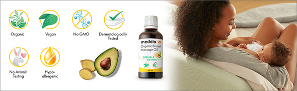 Mange kvinder, der ammer, får ømme og hævede bryster. Medelas økologiske og veganske brystmassageolie indeholder fødevaregodkendte, hypoallergene og naturlige ingredienser. Den dulmer ømme bryster hos ammende mødre gennem sin opvarmende og nærende effekt takket være Double Action™ af avocadoolie og ingefær. Medelas økologiske massageolie til brysterne er velegnet til sensitiv hud, er økologisk og vegansk certificeret, hypoallergen og dermatologisk testet. Det er også nærende og fugtgivende. Uden parfume, uden tilsætningsstoffer. Sikker for mor og baby, ingen grund til at vaske af før amning eller pumpning.