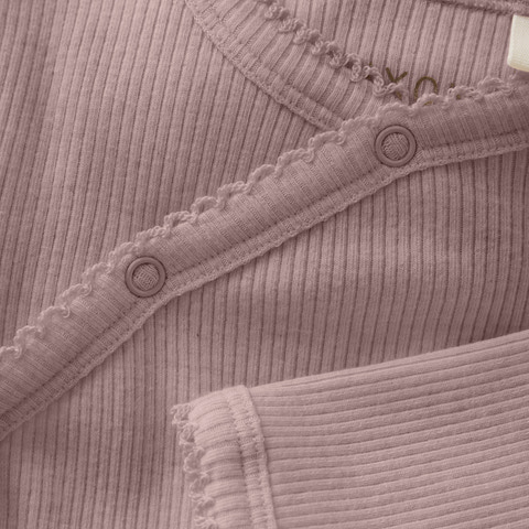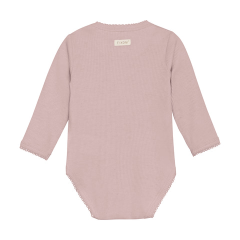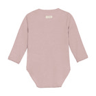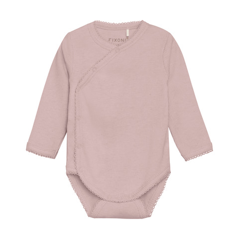 Langærmet slå-om-body fra FIXONI i ensfarvet mélange-kvalitet. Bodyen er fremstillet i en blød og behagelig kvalitet og lukkes nemt med trykknapper foran og mellem benene – praktisk ved både påklædning og bleskift.