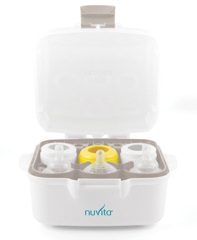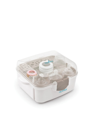 Kompakt sterilisator, der kan rumme op til 3 flasker med bred hals og tilbehør. Steriliserer hurtigt på 2 eller 4 minutter afhængig af mikroovns effekt. Udstyret med et praktisk tørrehul bagpå til at tømme eventuelt resterende vand, og et smart sidehåndtag for at undgå skoldning. Hvis det efterlades uåbnet, forbliver indholdet sterilt i op til 24 timer. Også velegnet til små mikrobølger takket være dets kompakte design (25 cm x 21,5 cm x 12,5 cm). 0% BPA.