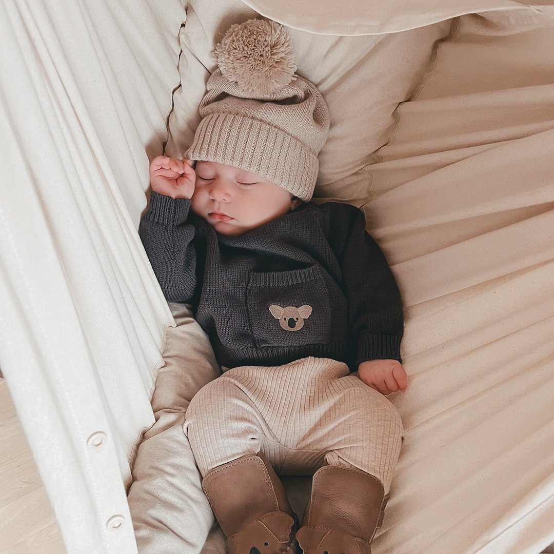 Moonboons slyngevugge er lavet i GOTS-certificeret økologisk bomuld, og madrassen er fyldt med kapok – et blødt, allergivenligt og temperaturregulerende materiale. Den står klar til dig, når du har brug for et sikkert, behageligt og beroligende søvnmiljø til din baby – fra nyfødt og indtil barnet vejer 12 kg.