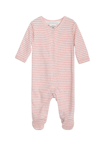 Heldragt til nyfødte i blød rib i striber. Fuld åbning foran og i ben så af- og påklædning er let. Åbnes med trykknapper. 100% blød økologisk bomuld.