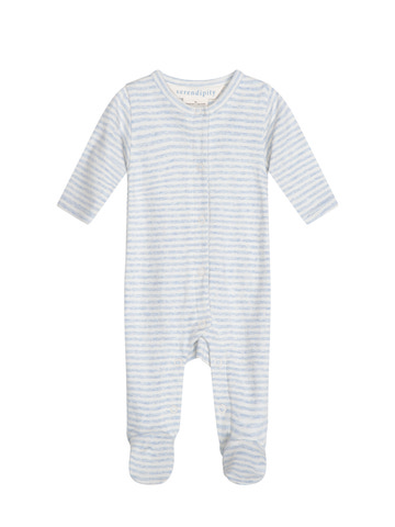 Heldragt til nyfødte i blød rib i striber. Fuld åbning foran og i ben så af- og påklædning er let. Åbnes med trykknapper. 100% blød økologisk bomuld.