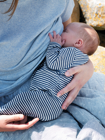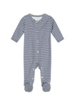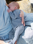 Heldragt til nyfødte i blød rib i striber. Fuld åbning foran og i ben så af- og påklædning er let. Åbnes med trykknapper. 100% blød økologisk bomuld.
