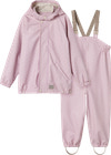 Regnsæt til børn. Regnbukserne er med seler og har elastik i siderne for at sikre den bedste pasform. Jakken har en lomme foran og lukkes med lynlås og trykknapper.