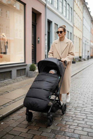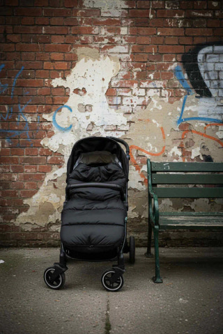 Indvendigt er køreposen foret med superblødt velboa-fleece, der føles som et kram, og fyldt med let, genanvendt, vaskbar polyester, som holder varmen uden at føles tung. Ydersiden er fremstillet af recycled polyester, der beskytter mod vind og fugt, så posen kan bruges hele sæsonen.