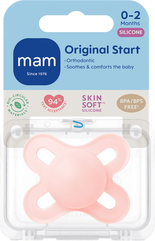 MAM Original Start er en ekstra lille og let sut, der passer til de mindste babyer. Sutten er hudvenlig takket være store lufthuller og MAM's unikke knoprede inderside. Sugedelen er lavet af silkeblød silikone, MAM SkinSoftTM, som føles blød og velkendt, ligesom mors hud, og som accepteres af 94% af babyerne*. MAM Start leveres i en praktisk opbevarings- og steriliseringsæske, som gør det nemt at sterilisere sutten i mikrobølgeovnen.