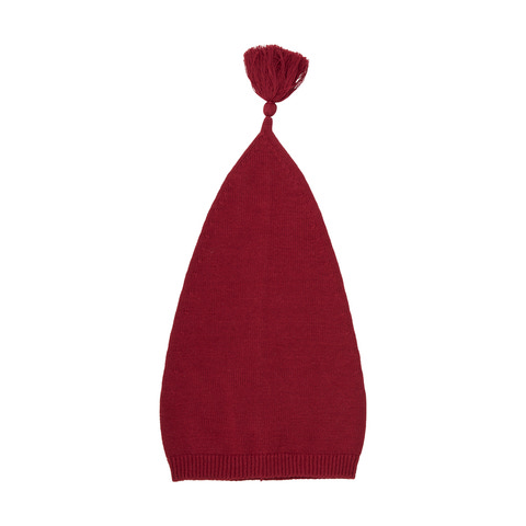 Blød og ensfarvet strikket pixiehue fra FIXONI. Huen har en karakteristisk spids form med en dekorativ kvast på toppen.