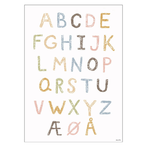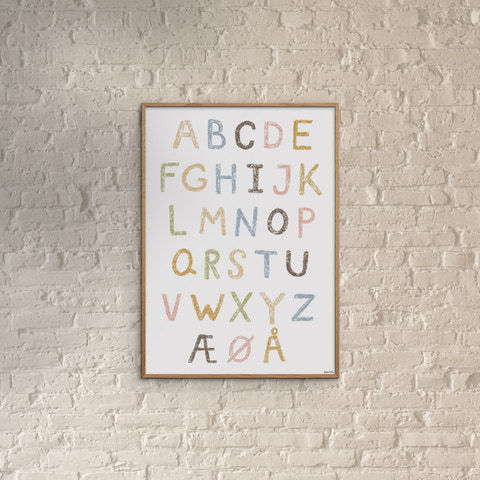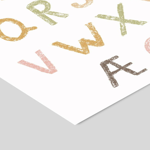 Gør indlæringen af alfabetet sjov og inspirerende med denne flotte ABC Kridt plakat fra Poster & Frame. Plakaten er designet med bogstaver i bløde, afdæmpede farver og en charmerende kridteffekt, der giver et kreativt og legende udtryk. Den er ideel til at hænge op på børneværelset, i legehjørnet eller i institutionen, hvor den både pynter og hjælper barnet med at lære bogstaverne. Plakaten indeholder hele det danske alfabet, inklusiv Æ, Ø og Å, og det stilrene A3-format gør den nem at indramme efter ønske. En skøn gaveidé til små nysgerrige sjæle, der er klar til at tage hul på bogstavernes verden.