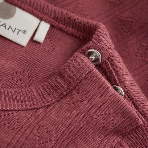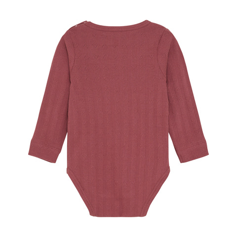 Sød body i pointelle med et elegant ternet mønster. Denne body er fremstillet i en blød og behagelig bomuldskvalitet, der føles skånsom mod den sarte hud. Den har lange ærmer og lukkes praktisk med trykknapper mellem benene, hvilket gør den nem at tage af og på. Et stilfuldt og komfortabelt valg til de mindste.