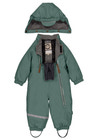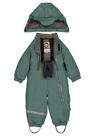 Denne praktiske dragt er lavet af 100% genanvendt polyester med blød polyurethan (PU) coating og polstret med polyesterfyld, så den holder barnet tør og varm. Overkroppen, hætten, kraven, og lommerne har ligeledes blødt fleece foer, hvorimod ærmerne og benene har en glat og gnidningsfri indvendig overflade.